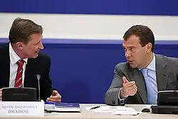Ivanov had held the posts of Minister of Defense of Russia from March 2001 to February 2007, of Deputy Prime Minister from November 2005 to February 2007, and of First Deputy Prime Minister from February 2007 to May 2008. After the election of Dmitry Medvedev as President of Russia, Ivanov was reappointed a Deputy Prime Minister (in office: 2008–2011) in Vladimir Putin's second cabinet. From December 2011 to August 2016, Ivanov worked as the Chief of Staff of the Presidential Executive Office.[2] Having served in the Soviet KGB and in its successor, the Federal Security Service, he holds the rank of colonel general.