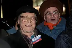 He became actively involved in a number of organisations that emerged then. In 1989, for instance, Andrei Sakharov recommended him as a co-director of the Project Group for defense of Human Rights, the short-lived Russian-American Human Rights Group. Some bodies like the "Glasnost" press club and the International Humanitarian Conference (December 1987) did not outlast the period: the Gorbachev Politburo was not keen to allow former dissidents to organise national or international gatherings, as their discussions reveal.[12] The Politburo and the KGB were similarly wary of Memorial, another new organisation that survives until this day.[13] Its dual focus on the repressive Soviet past and the human rights issues of the present, made it particularly suitable for Kovalyov's involvement and he served as its co-chairman for many years after 1990.
