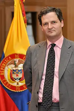 Sergio Jaramillo Caro (born October 17, 1966) is a Colombian diplomat, philosopher and politician.[2] From 2006 to 2009, he served as Vice Minister of Defense for Politics and International Affairs, during the administration of Álvaro Uribe, then from 2012 to 2017 he served as National Security Advisor from 2010 to 2012, and later as High Commissioner for Peace during the administration of Juan Manuel Santos From 2017 to 2018,[3] Jaramillo was Ambassador of Colombia to the European Union and Belgium.[4][5][6]