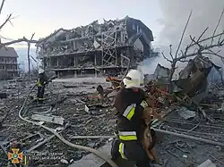 One missile hit a 9-story residential building, completely destroying one section.[5] The fire spread from the apartment building to the attached store.