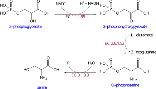 The biosynthesis of serine starts with the oxidation of 3-phosphoglycerate (an intermediate from glycolysis) to 3-phosphohydroxypyruvate and NADH by phosphoglycerate dehydrogenase (EC 1.1.1.95). Reductive amination (transamination) of this ketone by phosphoserine transaminase (EC 2.6.1.52) yields 3-phosphoserine (O-phosphoserine) which is hydrolyzed to serine by phosphoserine phosphatase (EC 3.1.3.3).[8][9]