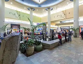 The 860,000-square-foot (80,000 m2) center underwent an expansion starting in the mid-2010s that added approximately 200,000 square feet (19,000 m2) of retail space, some in a new satellite building, and a multistory parking structure.[1][5] It was renovated in 2004 according to feng shui principles with the addition of a koi pond in the central grand court.[6] Another interior renovation took place in 2021, a 142-room hotel was added adjacent to the mall, and a medical office is also planned.[5]