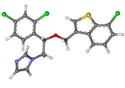Sertaconazole contains a stereocenter and consists of two enantiomers. The pharmaceutical drug is a racemate, an equal mixture of the (R)- and (S)-forms.[3]