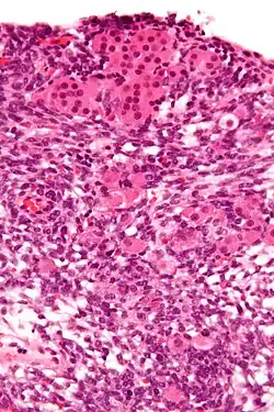 | Micrograph of a Sertoli–Leydig cell tumour. The Leydig cells have abundant eosinophilic or light pink cytoplasm. The Sertoli cells have a pale/clear cytoplasm. H&E stain. | |