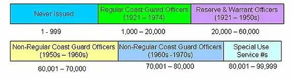 Coast Guard officer service numbers were unique amongst the military branches in that the entire range of officer numbers was declared upon the initial creation of the service numbers. The officer range extended from #1 to 100,000 and these numbers had yet to be exhausted by the discontinuation of Coast Guard service numbers in 1974.