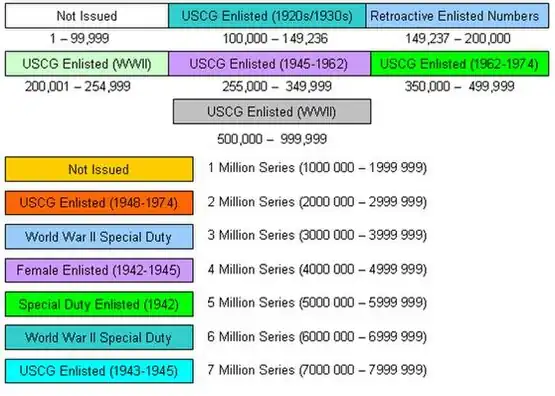 - The two million series (2000 000 – 2999 999) was not issued during World War, but the Coast Guard began using this series in 1948 and continued to issue these numbers until the discontinuation of service numbers in 1974.