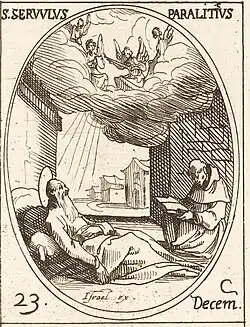 (6th cent.) A holy man who, paralysed all his life long, passed his days in prayer in the porch of the church of Saint Clement in Rome. When the hour of his death arrived he bade those surrounding him to cease from their chant of Psalms, as he already heard their words taken up by the Angels in Heaven. Saint Gregory the Great describes the scene in one of his Homilies, and seems to have known Saint Servulus personally.[2]