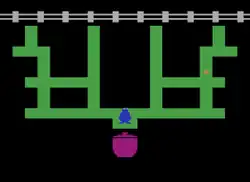 In Big Bird's Egg Catch, the player controls Big Bird as he saves eggs produced by chickens at the top of the screen. These eggs travel down variously contorted chutes to land safely in the basket perched on Big Bird's head. Most eggs count for a single point, but a golden egg will periodically appear that is worth five points. When an egg is dropped, a number of points are lost. At higher levels, the eggs move faster, the chutes become more convoluted, there are more egg-laying hens, and the chutes may even flash invisible. "Turkey in the Straw", the song that plays during the egg-catching, also increases in tempo.