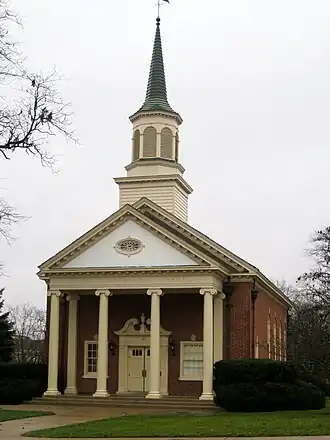 Sesquicentennial was built in 1959 to celebrate Miami University's 150th anniversary. The building is 6,341 square feet [2] and has a capacity of 218 people.[3] Cellarius and Hilmer designed it with a Colonial Revival and Early American Georgian style in mind.[4] Sesquicentennial Chapel is a one-story brick chapel (to blend in with the other buildings on campus) located at 551 East Spring Street in Oxford, OH.[5] On the main floor there is a sanctuary, office, and choir loft, and in the basement there is a meeting room (seating 48), restrooms, and Sayles Memorial Room.[4] The chapel contains two pianos and a digital organ.