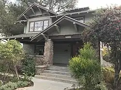 After settling in Pasadena, Rees commissioned the renowned Santa Barbara architect Francis W. Wilson to design a home in Pasadena's Normandie Heights neighborhood. The house exhibits typical Arts and Crafts features including clapboard siding on the first floor and wood-shingle wall cladding on the second floor and gables; wood double-hung and casement windows with divided lights; a wide wood front door with a large oval window; Arroyo-stone foundation, porch, columns and chimney; vented gables; exposed rafters on the horizontal portions of the roof and triangular braces on the sloping roofs. In light of the home's architectural significance, it has been designated an historical landmark by the City of Pasadena.[10]