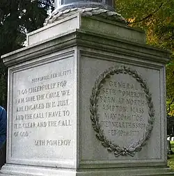 Honoring Seth Pomeroy in Hillside Cemetery is an estimated 26-foot high monument, being a large square base, a column, and a ball on top. Inscribed in a wreath on one side is "General Seth Pomeroy. Born at Northampton, Mass., May 20th 1706. Died near this spot Feb. 19th 1777." Inscribed on another side is a quote from him dated February 11, 1777, at Peekskill, perhaps referring to his facing his last days: "I go cheerfully, for I am sure the cause we are engaged in is just, and the call I have to it is clear, and the call of God."