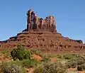 Setting Hen is situated 5.5 miles (8.9 km) northeast of Oljato–Monument Valley, Utah, on Navajo Nation land. It is an iconic landform of Monument Valley and can be seen from Highway 163. Precipitation runoff from this butte's slopes drains into the San Juan River drainage basin.[3] Topographic relief is significant as the summit rises 600 feet (183 meters) above surrounding terrain in 0.25 mile (0.4 km). The nearest higher neighbor is Eagle Mesa, 0.71 miles (1.14 km) to the southwest.[2] This landform's toponym has been officially adopted by the United States Board on Geographic Names,[1] and the descriptive name refers to the profile resembling a sitting hen when viewed from the southeast.[4]