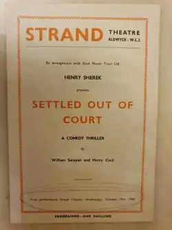Settled Out of Court is a 1960 comedy thriller play by William Saroyan and Henry Cecil.[1] It appeared at the Strand Theatre in London's West End with a cast including Nigel Patrick, Maxine Audley, Charles Heslop, Eric Pohlmann, John Stratton, Philip Guard and Mary Hignett. Patrick also directed the work.[2]