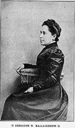 Sevasti Kallisperi was born in 1858 in Athens to Nicholas and Marigo Kallisperi. Her father, originally from Kalymnos, was an officer in the Greek War of Independence and after the establishment of the modern Greek state held several prominent positions, including Inspector of the Public Schools of Samos (1830), where he founded several primary schools; judge of Athens (1844); and the Prefect of Messenia (1855). The couple had three children and were staunch supporters of education.[1] Kallisperi's brother George would also become a soldier and later served in the 1897 Greco-Turkish War.[2]