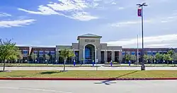 The school is located in the Katy Independent School District, and has the distinction of being the largest high school construction project at one time in the state of Texas.[10] Seven Lakes was designed by PBK Architects, as were many other area schools.[11] It was also the second largest, as well as the most expensive, school in the United States when it was opened. The total cost of the school came around to $77,424,704 after construction was complete.[11] The name of the school is derived from two major communities that are zoned to it, Seven Meadows and Grand Lakes, taking "Seven" from the name of the Seven Meadows community and "Lakes" from the name of the Grand Lakes community.[12] While the school is meant only for a maximum of 3,000 students, as with many other schools in KatyISD, it quickly became overcrowded due to the rapid development in the area. Seven Lakes reached its peak of 3,957 students in 2012 before many students were zoned to Tompkins High School.