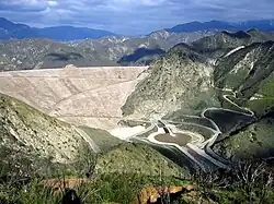 The USACE began an ambitious effort to improve levees and dams on the Santa Ana River system known as the Santa Ana River Mainstem Project.[4] Among the works proposed under the project were an expansion of the massive Prado Dam, which despite filling to capacity did not fully prevent heavy flooding damages in Orange County,[5] and the construction of the $530 million "Mentone Dam" across the Santa Ana north of Mentone in San Bernardino County.[6] However, the Mentone Dam site was controversial because it would affect groundwater recharge, was aesthetically unpleasing and lay on unstable sediment deposits directly above the San Andreas Fault.[6] In response to public opposition, the USACE replaced the Mentone proposal with the $304 million Upper Santa Ana River Dam, later to be called Seven Oaks Dam, in a bedrock canyon one mile (1.6 km) upstream in the southern San Bernardino Mountains.[7]