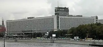 Designed by Mikhail Posokhin (Sr.) and Ashot Mndoyants. 160 metres tall, 22 floors (18 usable in the wings and 22 in the central part). The building is located on the end of Krasnaya Presnya street, facing the Sadovoye Koltso and was primarily built as high-end apartments for Soviet cultural leaders rather than politicians.
