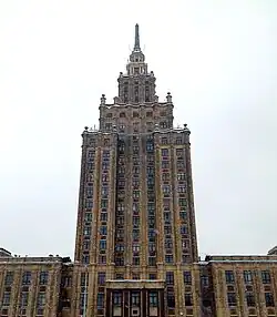 The Seven Sisters (Russian: Сталинские высотки, romanized: Stalinskije vysotki, lit. 'Stalin's high-rises') are a group of seven skyscrapers in Moscow designed in the Stalinist style. They were built from 1947 to 1953.[1] At the time of construction, they were the tallest buildings in Europe, and the main building of Moscow State University remained the tallest building in Europe until 1990.[2]