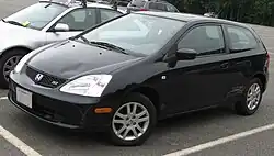 The seventh-generation Honda Civic is an automobile produced by Honda from 2000 until 2005. It debuted in September 2000 as a 2001 model. Its exterior dimensions stayed similar to the outgoing predecessor, with interior space significantly increased, bumping it up to the compact car size designation. A notable feature was the flat rear floor that gave better comfort to the rear seat passengers. This generation abandoned the front double wishbone suspension, used previously from fourth to sixth generations, replacing it with MacPherson struts. This generation was the last to offer 4WD variants.