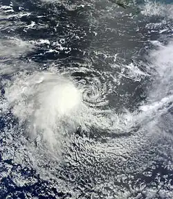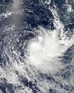 On 10 March 2013, the JTWC started tracking a tropical low approximately 426 km (265 mi) west south-west of the tip of Cape York Peninsula in the Gulf of Carpentaria. As the system began to move north-east, a subtropical ridge located to the south provided a good outflow channel, while vertical windshear continued to improve in the area. By 12 March, the JTWC upgraded the low's chance of developing into a tropical cyclone over the next 24 hours to medium. On 13 March, banding features began to wrap around the lows center, and the JTWC warned the system had a high chance of forming into a tropical cyclone over the next 24 hours, as it continued to move north-east.[54] Early on 14 March, the tropical low crossed Cape York and moved into the northern Coral Sea, encountering an area of warmer sea surface temperatures and high windshear. At 10:25am EST, the TCWC Brisbane named the storm Tropical Cyclone Tim, as it intensified into a Category 1 storm with 10-minute wind speeds of 65 km (40 mi). Located approximately 440 km (275 mi) north-east of Cairns, Tropical Cyclone Tim began to move in an east south-easterly direction towards Willis Island. It passed directly over the island, where the automated weather station recorded 10-minute wind gusts of 75 km (45 mi) before the station stopped recording.[55] By late on 14 March, Tim rapidly intensified into a Category 2 storm on the Australian Scale, with maximum 10-minute wind gusts of 95 km (60 mi) and a barometric pressure of 985 hPa, equal to a Tropical Storm on the Saffir–Simpson hurricane scale.