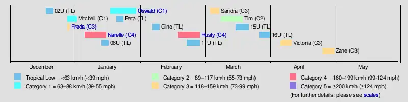 | Mitchell | 27 December – 1 January | Category 1 tropical cyclone | 85 km/h (50 mph) | 988 hPa (29.18 inHg) | None | None | None | None | |