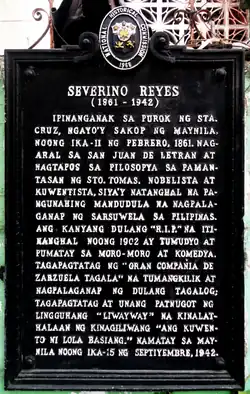 - ^ a b c d e Palafox, Quennie Ann (September 4, 2012). "The Life and Drama of Severino Reyes". National Historical Commission of the Philippines. Retrieved September 9, 2022.