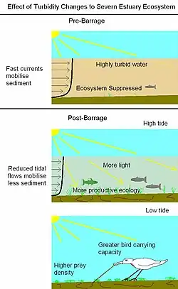 The present strong tidal currents in the estuary serve to lift up silt sediment and so keep the water thick with fine particles—around 30 million tonnes of suspended sediment move in the Estuary on a high Spring tide. This blocks light-penetration and means that the Severn Estuary marine environment is actually a relative desert, in terms of both plant and fish life.[57] The zone of maximum turbidity is confined to the inner Severn and does not extend westwards into the Bristol Channel.[58] An estimated 6.4 million tonnes/year of sand moves up and down the Bristol Channel[59] which would be blocked by a tidal barrage; the potential environmental consequences of interrupting this flux of sand include local coastal erosion and loss of coastal habitats.