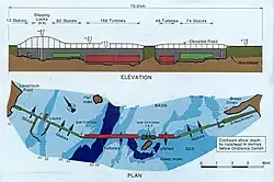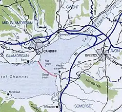 The Severn Barrage is any of a range of ideas for building a barrage from the English coast to the Welsh coast over the Severn tidal estuary. Ideas for damming or barraging the Severn estuary (and Bristol Channel) have existed since the 19th century. The building of such a barrage would constitute an engineering project comparable with some of the world's biggest. The purposes of such a project have typically been one or several of: transport links, flood protection, harbour creation, or tidal power generation. In recent decades it is the latter that has grown to be the primary focus for barrage ideas, and the others are now seen as useful side-effects. Following the Severn Tidal Power Feasibility Study (2008–10), the British government concluded that there was no strategic case for building a barrage but to continue to investigate emerging technologies.[1] In June 2013 the Energy and Climate Change Select Committee[2] published its findings after an eight-month study of the arguments for and against the Barrage. MPs said the case for the barrage was unproven. They were not convinced the economic case was strong enough and said the developer, Hafren Power, had failed to answer serious environmental and economic concerns.[3]