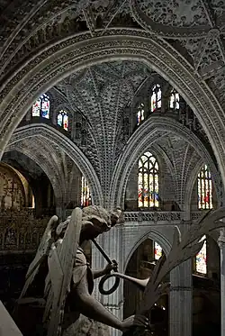 Work began in 1402 and continued for over a century.[12][13] The precise date when construction began is not certain, but some sources date it to 1433.[14][15] Several factors, including royal resistance to the temporary relocation of the royal chapel delayed construction. In 1433, King John II of Castille allowed the temporary transportation of the royal bodies from the old Capilla Real ('Royal Chapel') – including those of Alfonso X, Beatrice of Swabia, Ferdinand III, Peter the Cruel, and María de Padilla – to the cathedral's cloister for storage.[15]