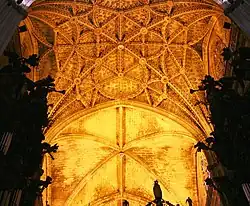 In 1511, however, the crossing lantern and some of the vaults collapsed, necessitating reconstruction. After some debate, the current crossing lantern, with its ornate lierne vaulting, was designed by Juan Gil de Hontañón the Elder in 1513 and completed in 1519.[12] In 1526 the central part of Dancart's retable was complete, but its side sections were only completed between 1550 and 1594.[12] After the completion of the Gothic cathedral, Seville's subsequent prosperity resulted in many additions to the building in Renaissance and Plateresque style.[12]