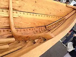 A well-known early example of a sewn boat is the 43.4-metre-long (142 ft) long "solar barque" or funerary boat on show near the Gizeh pyramid in Egypt; it dates back from c. 2500 BC. The sewn construction was a natural step when coming from raft or reed boatbuilding, which dates from some thousands of years before that. The oldest sea-going vessel was the Zambratija boat in Croatia, c. 1200 BC.[9] In other parts of the world, the oldest sewn craft comes from North Ferriby, where one sample (called F3) mass-spectrometry dates to 2030 BC. Later finds include some early Greek ships. The oldest Nordic find is the Hjortspring boat in Denmark (c 300 BC). In Finland, Russia, Karelia and Estonia small sewn boats have been constructed more recently; until the 1920s in poor areas of Russia.[10]