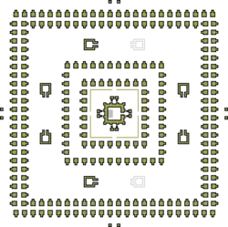 The Sewu temple complex is the largest Buddhist compound in the Prambanan area, with rectangular grounds that measure 185 meters north-south and 165 meters east-west. There is an entrance on all four cardinal points, but the main entrance is located on the east side. Each of the entrances is guarded by twin Dvarapala statues. These large guardian statues have been better preserved, and replicas can be found at Jogja Kraton. There are 249 buildings in the complex arranged in a Mandala pattern around the main central hall. This configuration expresses the Mahayana Buddhist view of the universe. There are 240 smaller temples, called Perwara (guardian) temples, with similar designs that are arranged in four rectangular concentric rows. The two outer rows are arranged closer and consist of 168 smaller temples, while the two inner rows, arranged at certain intervals, consist of 72 temples. The 249 temples located in the second precinct were all made with a square frame but varied by different statues and orientations. Many of the statues are now gone, and the arrangements on the current site are not in the original orientations. The statues are comparable to the statues of Borobudur and were likely made of bronze.[7]