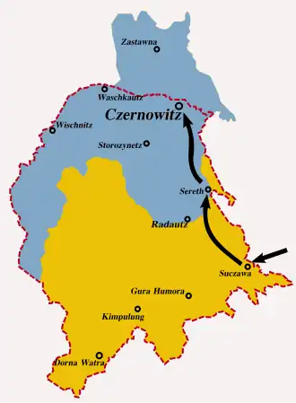 Pușcariu also met Romanian Premier Ion I. C. Brătianu, who advised him to push ahead with the union, noting that unification needed to be demanded and enacted without waiting on international arbitration.[50] Pușcariu reports that all of Brătianu's decisions on this issue were pre-approved by a bedridden Alexandru C. Constantinescu.[51] Pușcariu and Nistor traveled back to Czernowitz, then known as Cernăuți, where Nistor joined the CNR and drafted the act of union.[52] This document was in fact co-written by Duca and Constantinescu and Ion G. Duca—as Duca himself testified in his memoirs.[53]