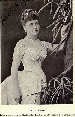 Henry Seymour King married Julia Mary Jenkins in Montreal, 21 October 1875. She was the daughter of Rev. John Jenkins, D.D., of Montreal, and his wife, Harriette, daughter of the late George Shepstone, Esquire, of Clifton, England. Lady King was Mayoress, for two years, of the Royal Borough of Kensington. During this period, she was president of the Queen's Jubilee Nurses' Endowment Fund, which raised the largest sum contributed by any borough in London, except the city, for that purpose. She was President of the Primrose League at Hull. She accompanied her husband in mountaineering expeditions in Switzerland. She was a keen yachtswoman, who regularly sailed with her husband in their yacht Glory. The couple lived at 25 Cornwall Gardens, South Kensington, London, England.[16]