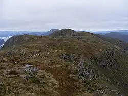 An old stalkers' path from the ruined cottage should guide the climber to a point just below a ridge at about 650 metres. The path was well built in its time but some sections have become wet and slippery. On gaining the ridge, turn left and follow the ridge to the 894 m triangulation point. The ridge becomes steep near the top but the steepest section can be bypassed. Contrary to the implication of the 1:50,000 Landranger map, several websites and the 1990 edition of the Scottish Mountaineering Club publication The Corbetts and other Scottish Hills, the true summit lies about 600 metres to the north west of the triangulation point.[1] List tickers should therefore turn right along the main ridge of the range and continue for about 600 metres to the main summit, which is not shown on any map. About 300 m further along the ridge is an 881 m summit, which is shown on topographic maps.