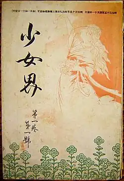As the Japanese publishing industry boomed during the Meiji era, new magazines aimed at a teenage audience began to emerge, referred to as shōnen.[13] While these magazines were ostensibly unisex, in practice the editorial content of these magazines largely concerned topics that were of interest to boys.[14] Faced with growing demand for magazines aimed at girls, the first shōjo magazines were published, and shōnen magazines came to target boys exclusively.[14] The first exclusively shōjo magazine was Shōjo-kai, first published in 1902. This was followed by Shōjo Sekai in 1906, Shōjo no Tomo in 1908, Shōjo Gahō in 1912, and Shōjo Club in 1923.[14] These magazines focused primarily on shōjo shōsetsu (lit. "girls' novel", a term for illustrated novels and poems aimed at an audience of girls) and only incidentally on manga.[15]