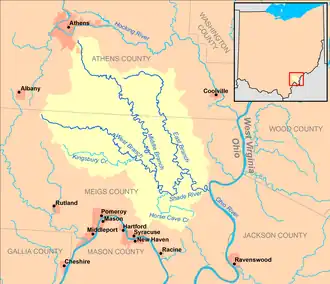 The Shade River is a tributary of the Ohio River in southeastern Ohio in the United States. Via the Ohio River, it is part of the watershed of the Mississippi River, draining an area of 221 square miles (570 km2) on the unglaciated portion of the Allegheny Plateau. The Shade River is 17.4 miles (28.0 km) long, or 38.2 miles (61.5 km) including its west branch.[6]