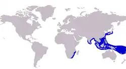The shadow trevally is distributed patchily throughout the tropical to subtropical waters of the Indian and west Pacific Oceans. The species' westernmost limit is a section of the east African coast from South Africa to Tanzania. No records exist for the species further north until India and Sri Lanka.[8] In the Pacific, the species is known from China, Korea, Southeast Asia, and the Indonesian and Philippines island chains. Its easternmost limit extends to Taiwan and Japan in the north and a number of small island groups including Tonga and Samoa in the south.[4]