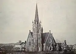 Built on land gifted by Thomas Aiken, the first Shadyside church was built to Aiken's designs. Work began in 1866 and was completed in 1867. By the early 1870s, the first building proved too small and plans were made for a second, larger building on the same site. Despite an economic depression in 1873, a second church was built to the plans of James H. Windrom of Philadelphia. Ground was broken in 1874 and the new building dedicated in 1875 with the first church building being retained for use as a chapel. With seating for 700 to 800, the second church was "English Decorated Gothic" in style and included a tower with spire which rose 140 feet into the sky.[4]