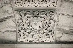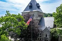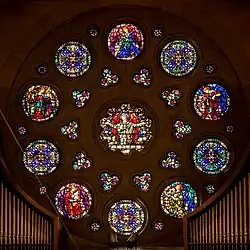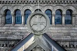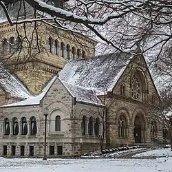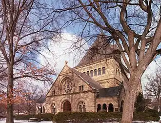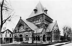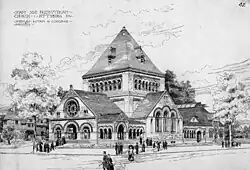 The Shadyside Church building, the congregation's third, is listed on the National Register of Historic Places as a prime example of Richardsonian Romanesque architecture. It was completed in 1890 to designs of American architectural firm Shepley, Rutan & Coolidge, the successor firm to H.H. Richardson's office.[3] The resulting design heavily echoes that of Richardson's Trinity Church in Boston. The interior of the church underwent several alterations during its first forty-eight years; what is largely seen in the worship space today dates from a major renovation undertaken in 1938. Elements of note include windows by the Gorham Company of New York, Tiffany & Company of New York, and Rudy Brothers of Pittsburgh; intricately carved stone and woodwork throughout, and a prominent Byzantine mosaic by Rudolf Scheffler which fills the chancel apse. The church is built in the Protestant "auditorium-style" popular in the late nineteenth century, a result of stout transepts and a large, central lantern tower which form a Greek cross in plan. The building's dominating pyramidal roof, adorned with four dormers (architecturally referred to as "witches hat"), features prominently in the neighborhood skyline.