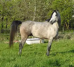 The breed is named for the major foundation sire Shagya, a gray Arabian[1] stallion with some ancestors of the Kehilan and Siglavy (Seglawi) strains. Born in Syria in 1810, he was taller than the average Arabian of the time, standing 15.2 1⁄2 hands (62.5 inches, 159 cm) at the withers. His weight was 530 kg. He was mostly used for crossbreeding at Babolna, bred few pure-blooded or asil Arabian mares, and thus has no pure Arabian descendants today.[2] Many of the Arabian stallions standing at Babolna and other studs were crossbred with mares who already possessed a great deal of Arabian influence due to the long Turkish occupation of Eastern Europe. Some Thoroughbreds and Lipizzans were also used. In all cases, meticulous pedigree records were kept.[1]