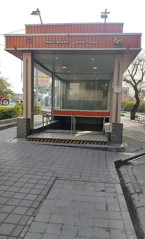 Beheshti Metro Station is a station in Tehran Metro Line 1.[1] It is located in the junction of Dr. Mofatteh Street and Beheshti Street. It is the intersection of Line 1 and Line 3. It is between Shahid Mofatteh Metro Station and Mosalla Metro Station on Line 1 and Mirzaye Shirazi Metro Station and Sohrevardi Metro Station on Line 3.