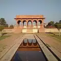 The square shaped terraces were both divided into four equivalent smaller squares by long fountains flanked by brick khayaban walkways designed to be elevated in order to provide better views of the garden.[8] Cascades were made to flow over a marble paths in what are known as chadors, or "curtains" into the middle terrace. Water collected into a large pool, known as a haūz, over which a seating pavilion was made.[2]