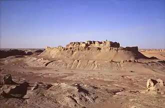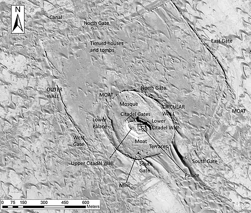 The Helmand Sistan Project, a joint American and Afghan archaeological research team in this region that worked from 1971 to 1979, explored the standing monuments of this site that date from the Islamic period in the Sistan and were built by the Saffarid kings in the 9th or early 10th century. In addition to the Citadel and its palace, they include a mosque, a bazaar and a caravanserai to the north of the Citadel and a neighborhood of elaborate houses in the east,.[5] Excavations of the Citadel by the archaeologists showed that the standing monuments were built on large public buildings of pre-Islamic periods in this region, one Sasanian and another Parthian beneath.[5] The three-storied Citadel Palace is perhaps the only known monumental Saffarid building extant. It is unusual in its design with a serpentine outer wall of baked brick, non-squared corners, and a location at the eastern edge of the Citadel rather than the center. The Saffarid buildings were reused in the Ghaznavid and Ghurid periods and some changes were made in them, including the addition of a bathhouse on the Citadel and an expansive Lower Palace in the enclosure beneath, until they were destroyed by Genghis Khan's army in 1222. The date of the conquest is confirmed by a set of coin hoards sequestered along the bazaar uncovered by the archaeologists from that date. During the period of Timur Lang,[6] this area witnessed wars and was destroyed, but the successors of Timur also built or restored some buildings. The remains of this period were very few and mainly included mansion houses and canals built inside the outer defensive walls, which had gone out of use.[5]