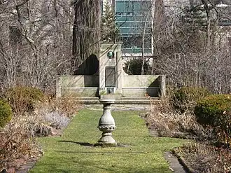 The Shakespeare Garden is located on the Northwestern University campus at the corner of Sheridan Road and Garrett Place, near the Howes Chapel and Garrett–Evangelical Theological Seminary.[2] The garden is 70 feet (21 m) wide by 120 feet (37 m) long and is divided into eight flower beds. The four outer beds are designed informally, while the four inner beds are knot gardens; the outer and inner beds are separated by boxwood plants. The borders of the garden are lined with hawthorn trees, many of which were imported from France when the garden was first planted.[3] The more than fifty varieties of plants in the garden were either mentioned in Shakespeare's works, common in the Tudor period in England, or are cultivars of plants in the other two categories.[3] The garden also includes a fountain with a plaque honoring Shakespeare and a stone memorial designed by Hubert Burnham, the son of architect Daniel Burnham.[4]
