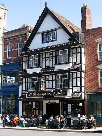 Shakespeare Inn is a 17th-century pub on Victoria Street, in Bristol, England. It is a timber-framed house, dated 1636 on the front, which was extensively restored in 1950, under the direction of F. L. Hannam,[1] and re-roofed in 1992. It has been designated by English Heritage as a grade II listed building.[2]