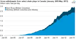 The US Energy Information Administration estimated in 2013 that there were 573 trillion cubic feet (tcf) of technically recoverable natural gas in Canada.[3]