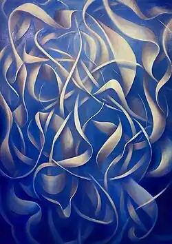 The series displays Guffogg's illuminated ribbon motif created in combination with oil paint and resin. The combination of these two materials gives these paintings bursts of light. The tangled ribbons give hints at Leonardo's portrait of de Benci and feminine shape.[21] One can see how Guffogg utilizes abstraction and string theory, modern mathematical and scientific tools, and how Da Vinci utilized classicism and science and math of his time within his work.[22]