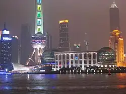 The Shanghai International Convention Center (SHICC, Chinese: 上海国际会议中心) is a convention center in Lujiazui Financial District in Pudong New Area, Shanghai, China, built in 1999. The building is adjacent to Shanghai's skyline of spectacular skyscrapers, including Oriental Pearl Tower, Shanghai Tower and Shanghai World Financial Center. Visitors in the center can have a panorama view of the Bund of Shanghai right across the Huangpu River.[1]