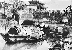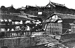 There may have been some sort of defensive works around the county seat of Shanghai from the 11th century.[1] The city wall, which survived until the 20th century and parts of which remain to this day, was, however, built in 1554 during the Ming dynasty, in order to protect the town from raids by Japanese pirates. It measured 10 metres (33 ft) high and 5 kilometres (3.1 mi) in circumference.[2] In addition to the local garrison, the city was surrounded by Qing army posts at Jiangning (Nanjing), Jingkou (Zhenjiang), Hangzhou, and Zhapu.[3]
